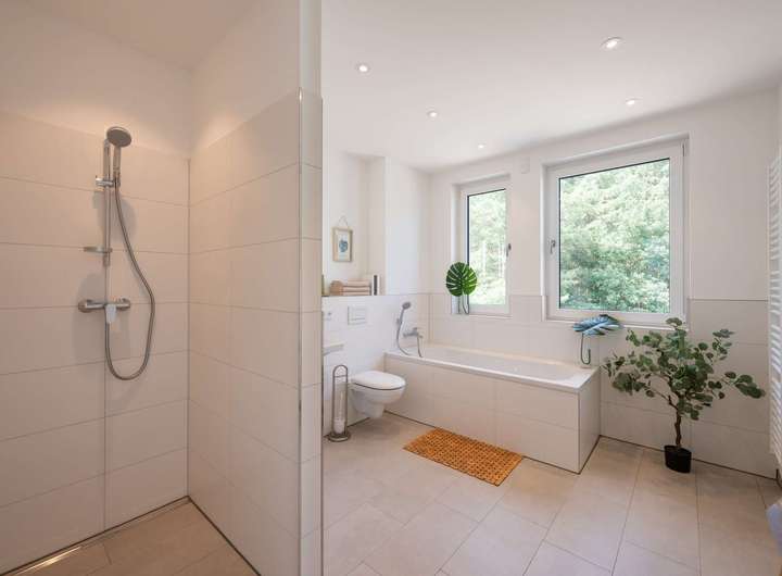 Im Obergeschoss befindet sich das helle Schlafzimmer. Gegenüber liegt ein großes Wannen-Dusch-Bad mit Tageslicht. Zudem befindet sich im Erdgeschoss ein vollwertiges Duschbad. Die Fußbodenheizung mit Einzelraumregelung liefert in allen Wohnräumen wohlige Wärme. In den Wohn-, Schlaf- und Kinderzimmern ist Mehrschicht-Eichenparkett verlegt, das für einen angenehmen Komfort sorgt.