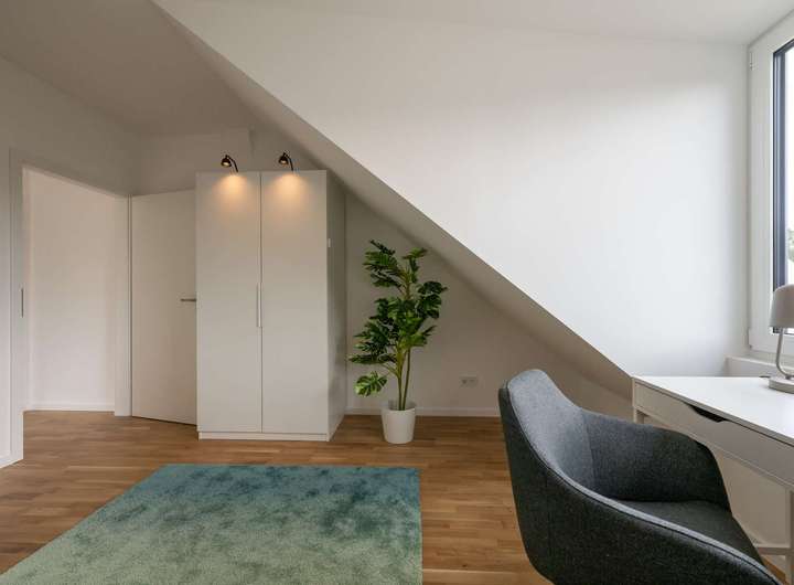 Das Haus ist vom Keller über die beiden Etagen bis ins ausgebaute Dachgeschoss mit Smart-Home-Technik für angenehmen Komfort ausgestattet. Über die Displays und das eigene Smartphone lassen sich Fußbodenheizung, Jalousien und Licht bequem mobil steuern. Stabiles Internet über Glasfaser sorgt für sichere Konnektivität beispielsweise im Homeoffice. Die Energieversorgung zielt auf Nachhaltigkeit: Strom und Heizenergie werden über Kollektoren „auf dem eigenen Dach“ gewonnen und in einem Wärmepumpenspeicher gespeichert. Durch diese Kombination aus Photovoltaik-Anlage und Sole-Wasser-Wärmepumpe erfolgt die Heizungs- und Warmwasserbereitung autark, also unabhängig von Gas- und Ölpreisen. Die E-Ladesäule an den Pkw-Stellplätzen direkt am Haus liefert einen weiteren Beitrag zu einer CO2-neutralen, emissionsarmen Energiebilanz.
