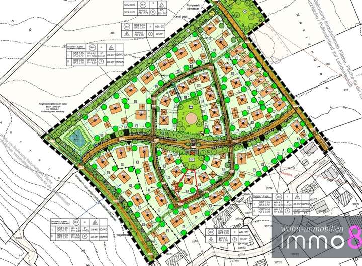 Die Erschließung der Grundstücke ist weitestgehend abgeschlossen, auf den Zufahrtsstraßen wurde die Rohteerschicht bereits aufgetragen.
