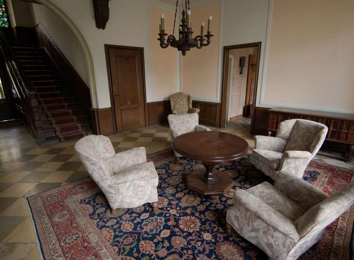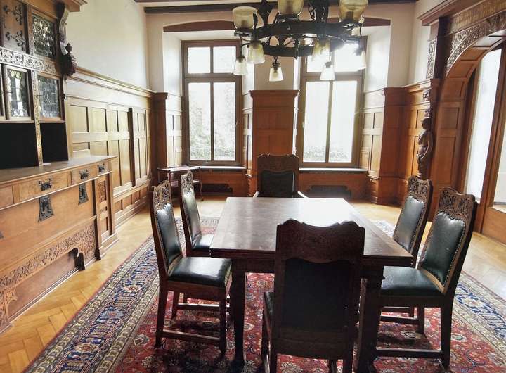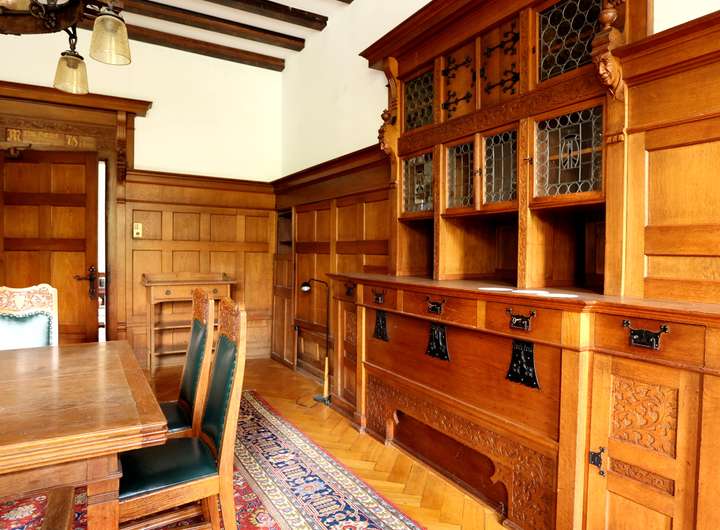 Original erhaltenes Esszimmer, Diele und Treppenhaus aus dem 19. Jahrhundert, hochwertiges Parkett und Fliesen im Erdgeschoss. Einbauküche. Teilweise Möblierung, die übernommen werden kann.