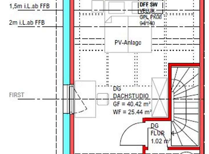 Im Dachgeschoss befindet sich ein helles und geräumiges Studio, das flexibel als Arbeitszimmer, Gästezimmer oder zusätzlicher Wohnraum genutzt werden kann. Der Technikraum für die Unterbringung von der Heizungsanlage und anderen technischen Einrichtungen befindet sich ebenfalls im DG.
