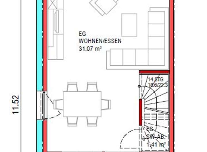 Das Erdgeschoss setzt sich zusammen aus einem großzügigen Wohn- und Esszimmer mit viel Tageslicht, einem praktischen Abstellraum, einem Gäste-WC für Komfort und Privatsphäre sowie einer gemütliche Terrasse für entspannte Stunden im Freien.