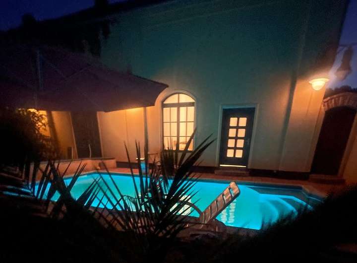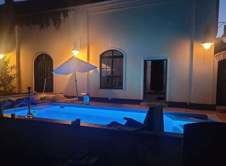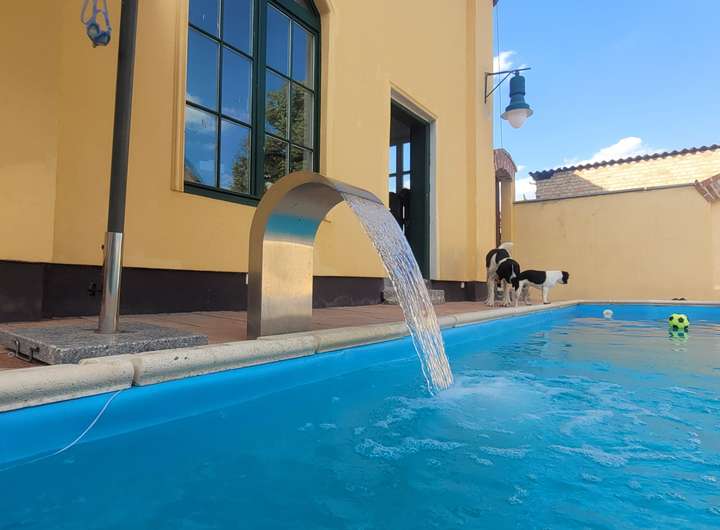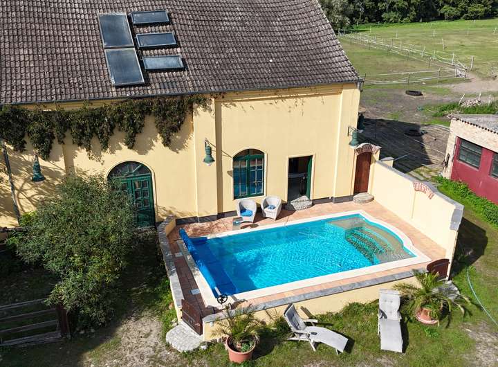 Die Hoffläche ist komplett mit Feldsteinen gepflastert. An der südwestlichen Seite der Scheune wurde 2022 ein massiver 8 m x 4 m großer massiver Pool mit Beleuchtung, Solarheizung und vorbereiteter Gegenstromanlage und römischer Treppe errichtet. Er ist mediterran umhaust und bildet zusammen mit dem sich in der Scheune befindlichen Poolpartyraum ein chilliges Freizeitensemble.