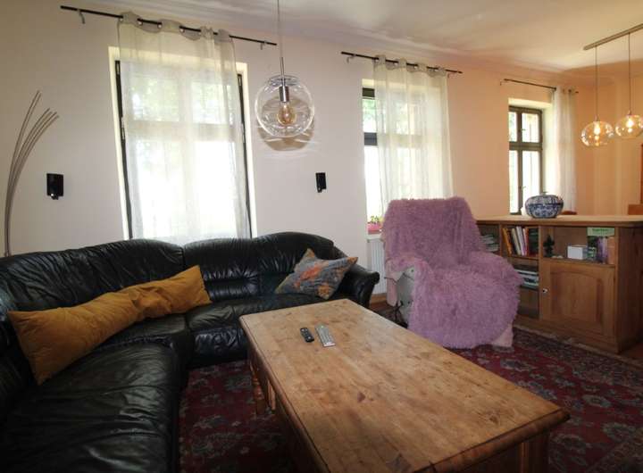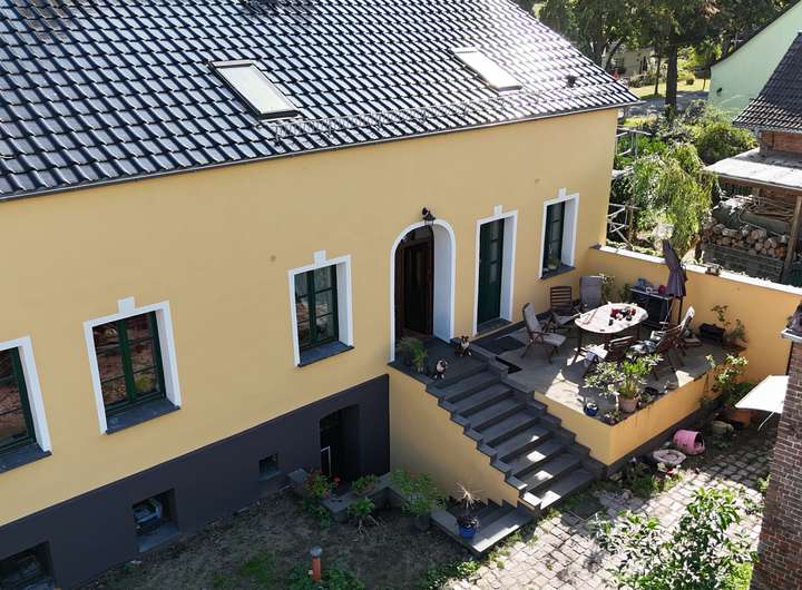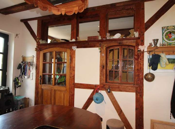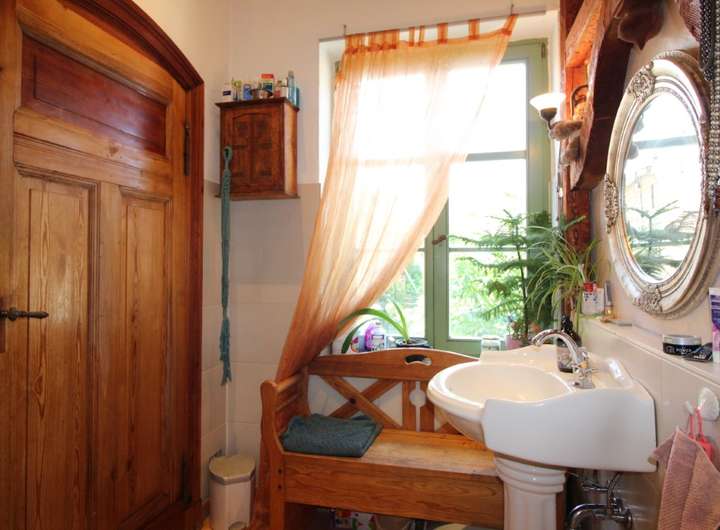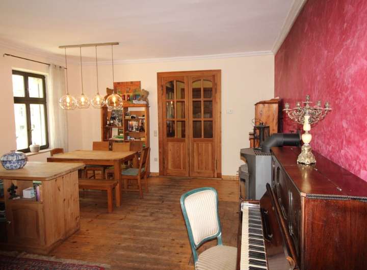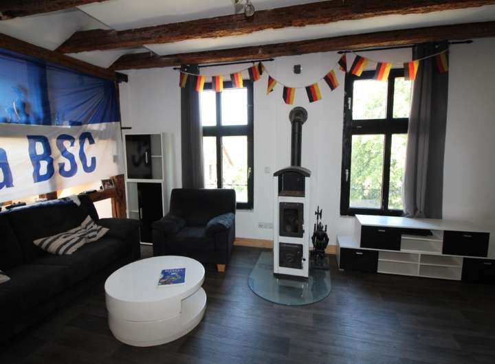 Dem Besuchenden empfängt ein historisch nachempfundenes Wohngefühl. Alte aufgearbeitete Holzdeckenbalken sowie Fachwerk- Holzbalkenelemente mit Verglasungen als Raumteiler bestimmter Wohnbereiche, aufgearbeitete alte Holzdielungen, Terracottafliesen, historisch nachgebaute Holzfenster und original restaurierte Türen versetzen einen zurück in die Epoche der Gründerzeit.