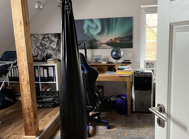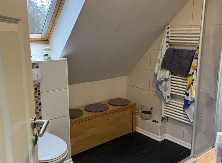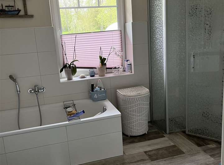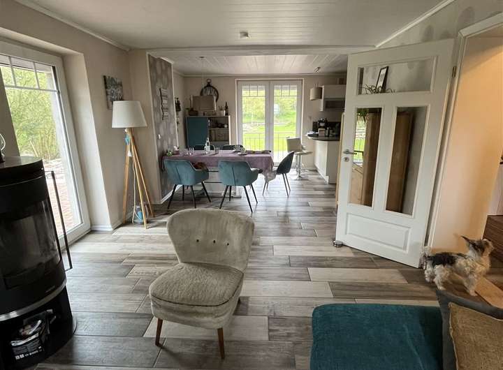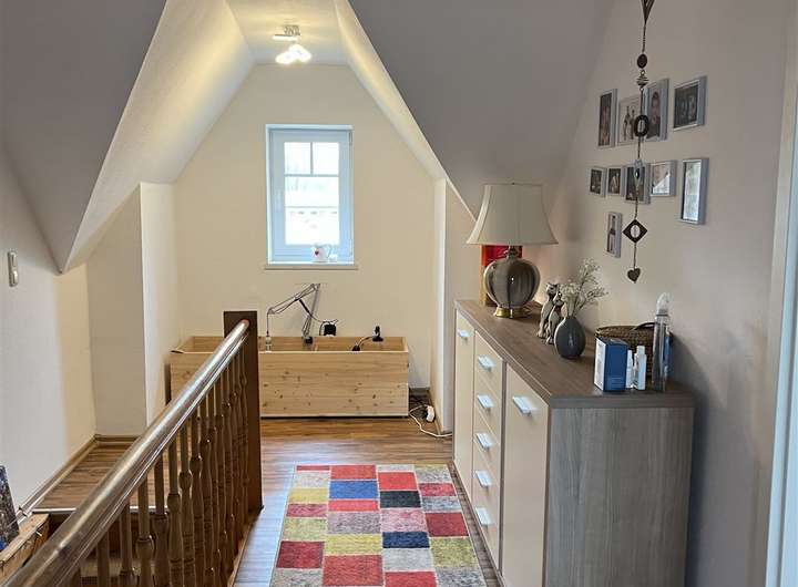Das Haus - Hochparterre - mit einer Wohnfläche von ca. 140 m² wurde hochwertig ausgebaut. Das Einfamilienhaus aus dem Jahr 1920/1930 wurde zuletzt von 2016 - 2020 komplett saniert. Die Ölheizung (2016) versorgt das Einfamilienhaus. Das Erdgeschoss ist zusätzlich mit einer Fußbodenheizung ausgestattet. Auf dieser Ebene ist ein großer, offener Wohn-Küchenbereich mit Kamin und bodentiefen Fenstern mit Zugang zur Terrasse, das Vollbad, das Schlafzimmer und der Hauswirtschaftsraum. Im Obergeschoss befinden sich das Duschbad sowie drei weitere Zimmer von denen aus eins Zugang in die Spitze hat. Das Objekt ist vollunterkellert, ein Kellerausgang führt in den gepflasterten rückseitig am Haus befindlichen Hof mit vielen Sitzmöglichkeiten. Ein atemberaubender Ausblick zum Schloss Katelbogen lädt zum Entspannen ein. Ein Doppelcarport mit Wallbox, eine Garage inkl. Werkstatt und ein Zaun als Sichtschutz zum angrenzenden Haus ergänzen das Angebot.