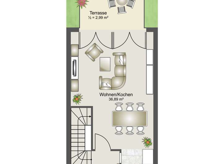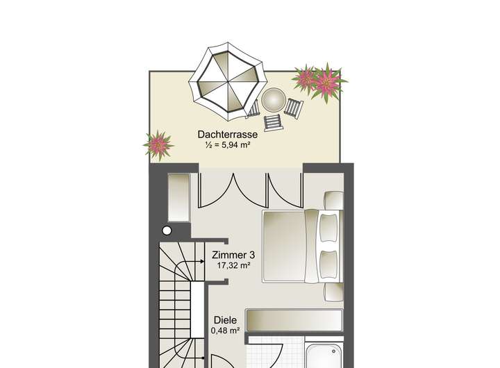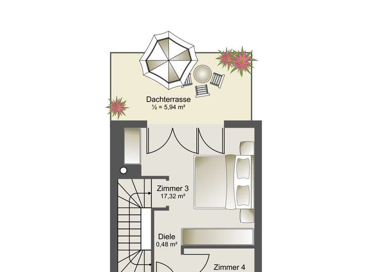 Genießen Sie entspannte Stunden auf der Süd-West-Terrasse oder im eigenen Garten. Die Terrassen bieten Ihnen und Ihrer Familie zusätzlichen Raum zur Erholung. Für besondere Anlässe steht Ihnen auch eine Dachterrasse zur Verfügung.
