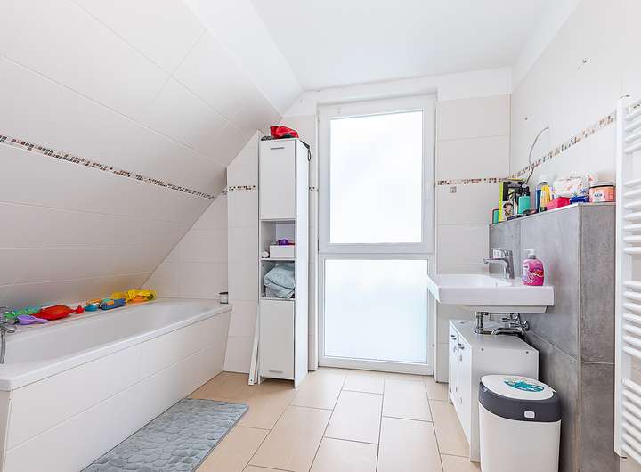 Obergeschoss: 2 Zimmer, Badezimmer mit Dusche und Badewanne, Flur