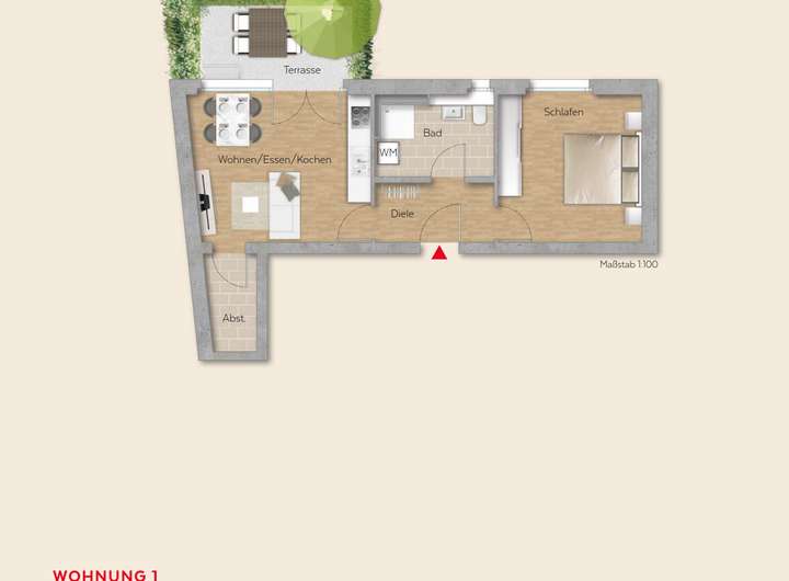 Der offen gestaltete Wohn- und Essbereich mit direktem Zugang zur eigenen Terrasse lädt zum Entspannen und Wohlfühlen ein – hier genießen Sie eine kleine Oase im Grünen.