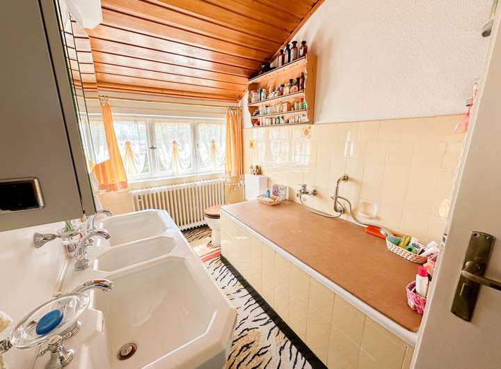 Badezimmer: mit Badewanne, zwei Waschbecken und WC.