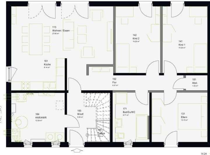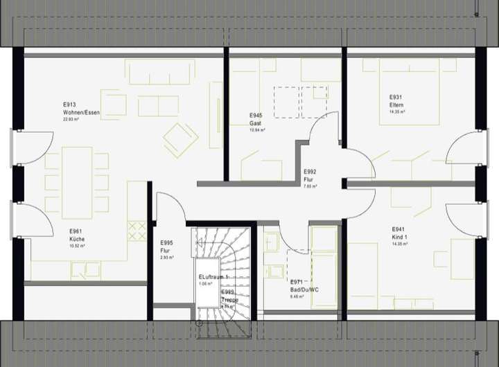 Mit der Option "Einliegerwohnung im DG" bietet das attraktive Mehrgenerationenhaus FamilyStyle 21.01 S auf insgesamt ca. 214 m² Nettogrundfläche genügend Raum für zwei getrennte Haushalte unter einem Dach. Die mit ca. 97 m² sehr großzügig angelegte Dachgeschosswohnung umfasst dabei nicht nur zwei Schlaf- und ein Gast-/Arbeitszimmer sowie ein zentrales Bad, sondern glänzt darüber hinaus auch mit einem einladend offenen Wohn-, Ess- und Küchenbereich. Auf einer Nettogrundfläche von ca. 117 m² präsentiert sich die Erdgeschosswohnung noch weitläufiger: Im Anschluss an den zentralen Eingangsbereich mit Hauswirtschaftsraum und separatem Aufgang zum ersten Stock öffnet sich der helle, seitlich bodentief verglaste Wohn-Essbereich, der über Eck nahtlos in die Küche übergeht. Rechterhand verbindet ein langer Flur die beiden Kinder- und das Elternzimmer mit Bad, Dusche und WC.