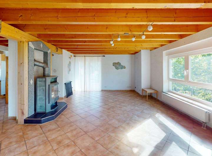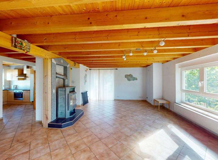 Ein stilvoller, offener Wohn-Essbereich mit Kaminofen schafft eine behagliche Atmosphäre.