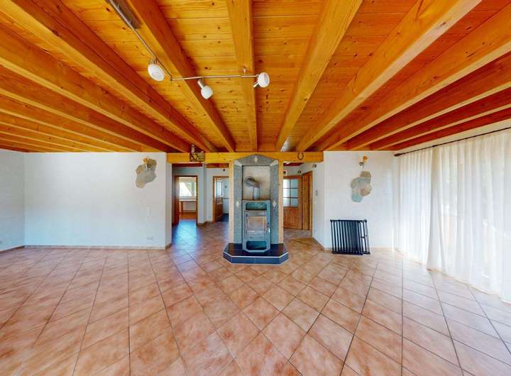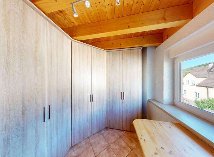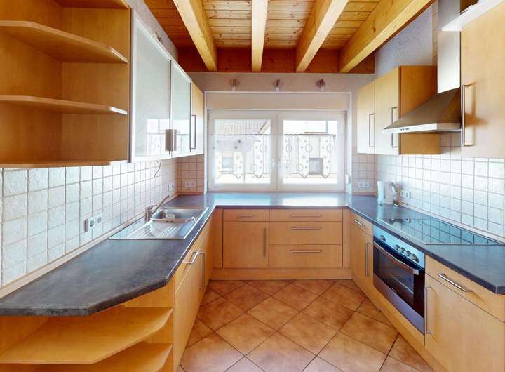 Die angrenzende Küche sowie ein praktisches Büro und eine Gäste- WC runden das Raumangebot im Obergeschoss ab.