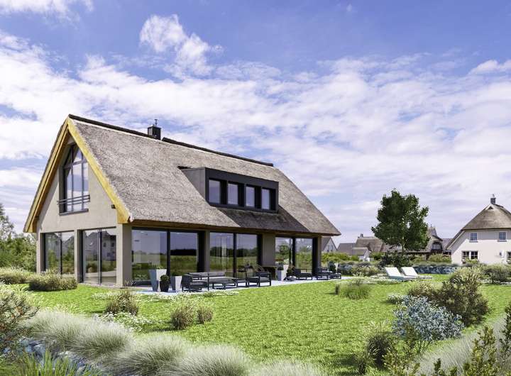 Wenige Geh - Minuten zum Naturstrand, sehr ruhige und idyllische Naturlage mit unverbaubaren 180 Grad Blick, am idylischen Froschteich, gepflegte lockere Umgebungsbebauung, vollständig eingefriedetes Grundstück auf Wunsch mit Gartengestaltung – in Absprache, wie im Beispiel des Digitalstagings