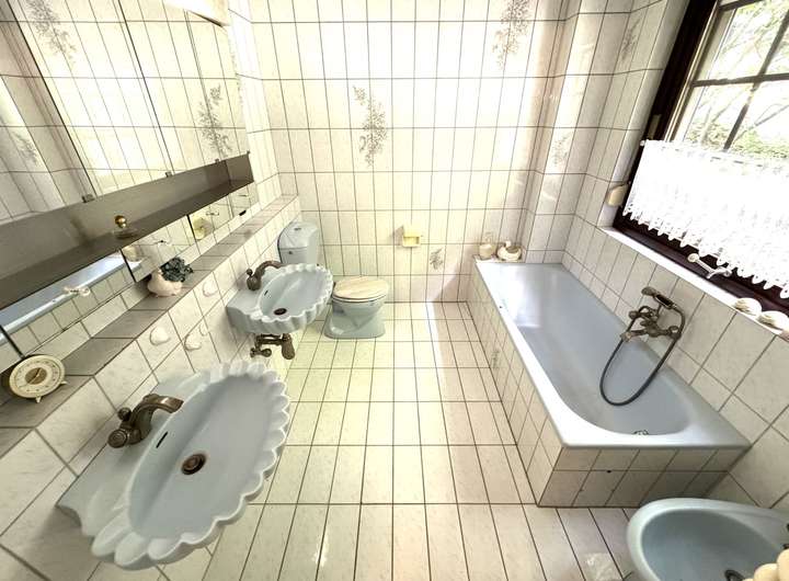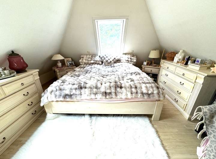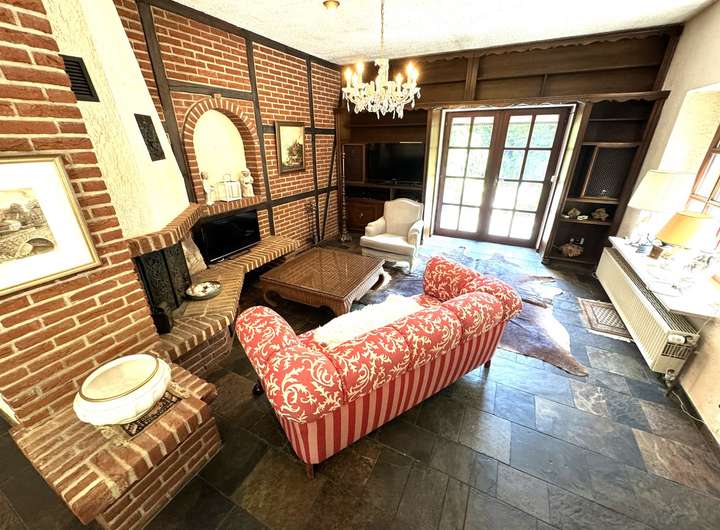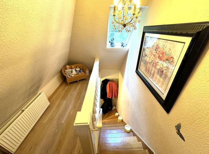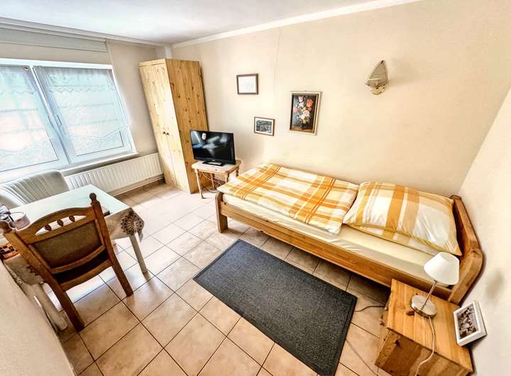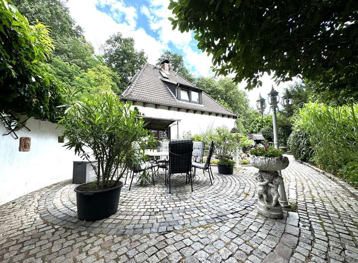 Das Grundstück liegt im Naturschutzgebiet und ist mit einem Zweifamilienhaus und mehreren Nebengebäuden bebaut. Das Hauptgebäude ist ein 1952 erbautes Zweifamilienhaus. In der Erdgeschosswohnung befinden sich ein großes Wohnzimmer mit offener Küche, ein Schlafzimmer und ein Badezimmer sowie eine Gästetoilette. Über einen separaten Eingang auf der Rückseite des Hauses gelangt man in die Obergeschosswohnung. Diese ist ebenfalls mit Bad, Küche und Wohnzimmer ausgestattet. Vom Wohnbereich gelangt man über eine Treppe in den ausgebauten Spitzboden, der als Schlafzimmer dient.
