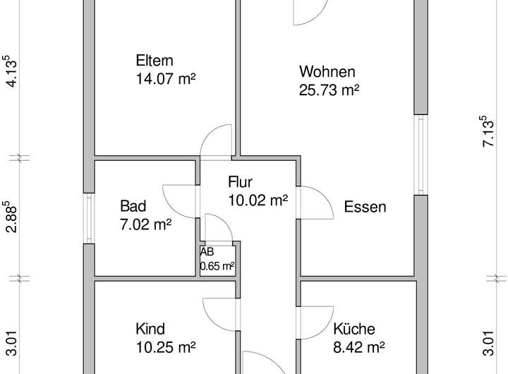 Eingangsdiele, Wohn- und Esszimmer mit Zugang zum Garten, Küche, Schlafzimmer, Kinderzimmer, Badezimmer und Flur.