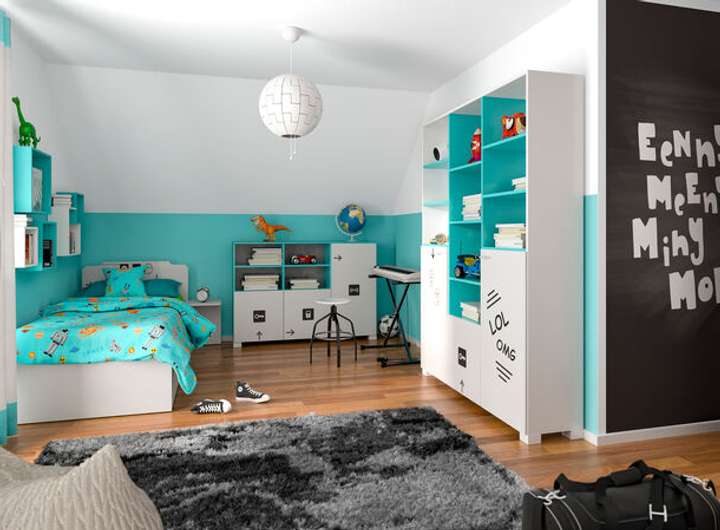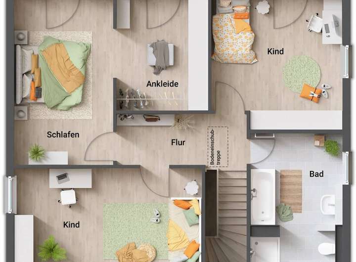 Auch das Obergeschoss zeigt sich im gradlinigen Baustil des Hauses. Hier finden Sie drei Zimmer, die Sie nach Ihren Vorstellungen als Schlaf-, Kinder- oder Gästezimmer nutzen können. Große Fenster lassen auch hier viel Tageslicht hineinströmen. Die Ankleide im Schlafzimmer bietet viel Stauraum.