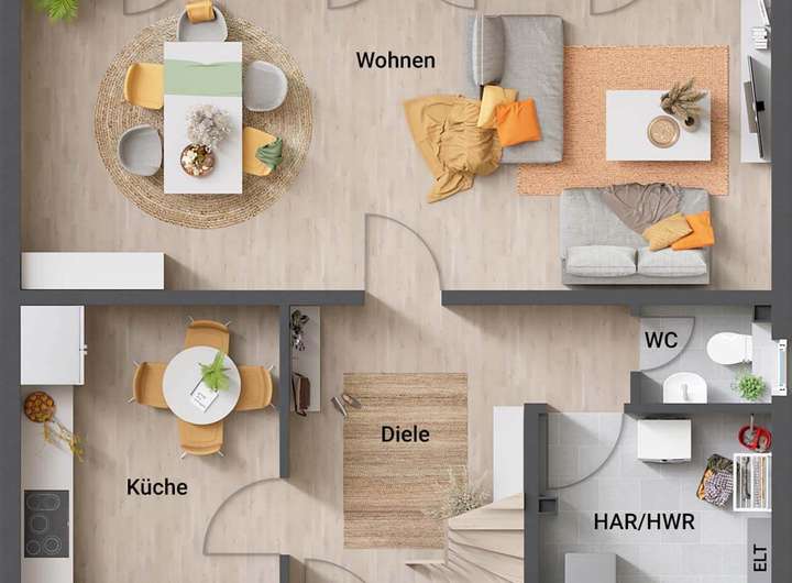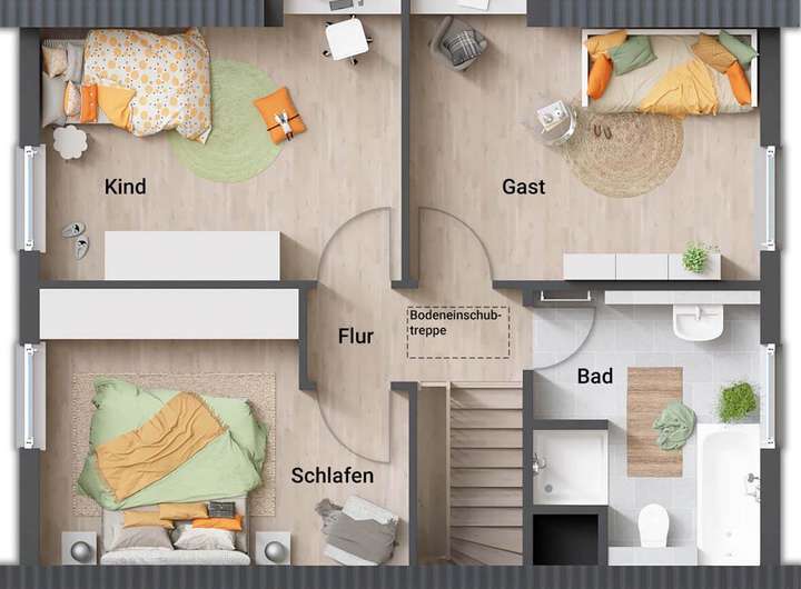 Das Flair 113 bietet alles, was ein Massivhaus gemütlich macht. Im Erdgeschoss betreten Sie ein geräumiges Wohn- und Esszimmer, eine Küche mit genügend Freiraum, ein Gäste-WC und einen Hauswirtschaftsraum mit ausreichend Platz für Waschmaschine und Co. Im Dachgeschoss erwarten Sie neben drei weiteren geräumigen Zimmern ein komfortabel ausgestattetes Badezimmer.