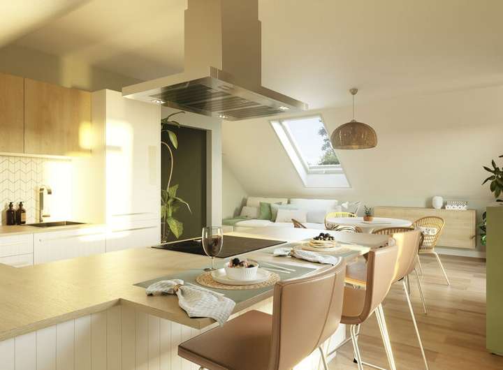Das Mitwachshaus Flair 148 hat alles, was ein Haus zum Wohlfühlen benötigt: ein gemütliches Wohnzimmer mit hellem Essbereich und großen Fenstern, die viel Tageslicht hinein lassen. Die geräumige Küche bietet nicht nur Platz für das Familienfrühstück unter der Woche.