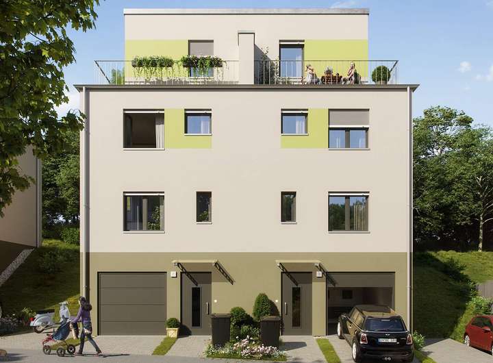 Diese Doppelhaushälfte bietet Ihnen auf vier Etagen maximales Wohnvergnügen. Im Souterrain erwartet Sie ein großzügiger Eingangsbereich mit direktem Zugang zur In-House Garage, in der Sie Ihr Auto sicher und wettergeschützt parken. Ein großer Kellerraum rundet dieses Geschoss ab. Ein großer und offener Wohnbereich mit angrenzender Küche im Erdgeschoss sorgt für ausreichend Platz, um sich zu entfalten. Die angrenzende Terrasse ist ideal für entspannte Abende im Freien. Eine Treppe höher genießen Sie zwei helle und freundliche Zimmer. Ihr Badezimmer wird zum Wohlfühlort – mit Tageslicht, einer Badewanne zum Entspannen und einer ebenerdigen Dusche für den frischen Start in den Tag. Homeoffice, Gästezimmer oder kreativer Raum – das ausgebaute Studio mit umlaufender Dachterrasse bietet Ihnen vielfältige Nutzungsmöglichkeiten.