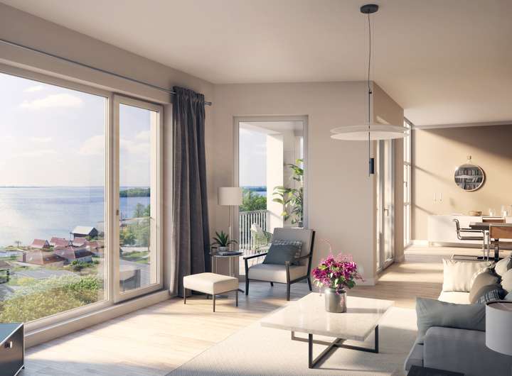 Die 2,60 m hohen Fenster sorgen für eine angenehme Lichtdurchflutung und bieten eine großartige Aussicht auf den Schweriner See und die Umgebung. Die Fenster werden im Rahmen des sommerlichen Wärmeschutzes durch Zip-Screens/Fallmarkisen vor der Sonne geschützt und bieten trotz dessen Sicht von Innen nach Außen. Eine Raumhöhe von ca. 3 Meter findet man heute kaum noch im Neubau, hier ja.