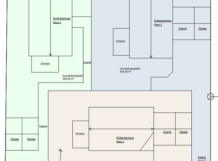 Insgesamt verfügt es über 1.561 m² Fläche und wird auf 3 Grundstücke für Einfamilienhäuser geteilt.