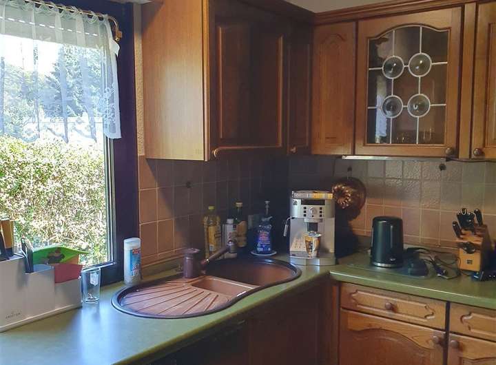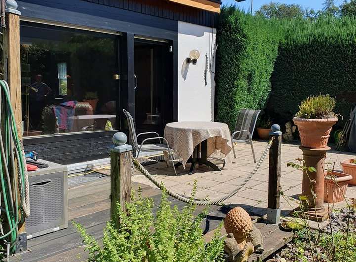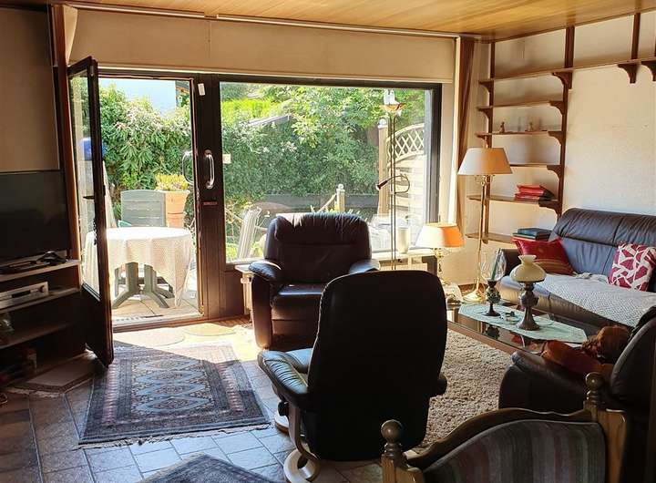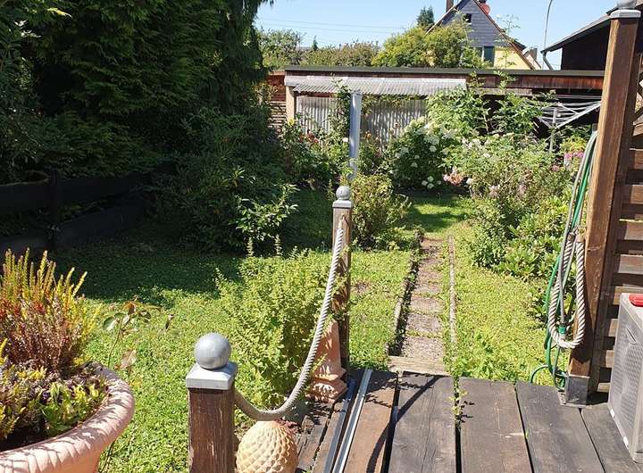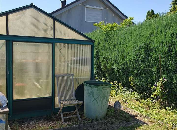 Zur Wohnung im Untergeschoss gehört eine Terrasse über welche man in den sonnigen Garten mit großem Gewächshaus gelangt.
