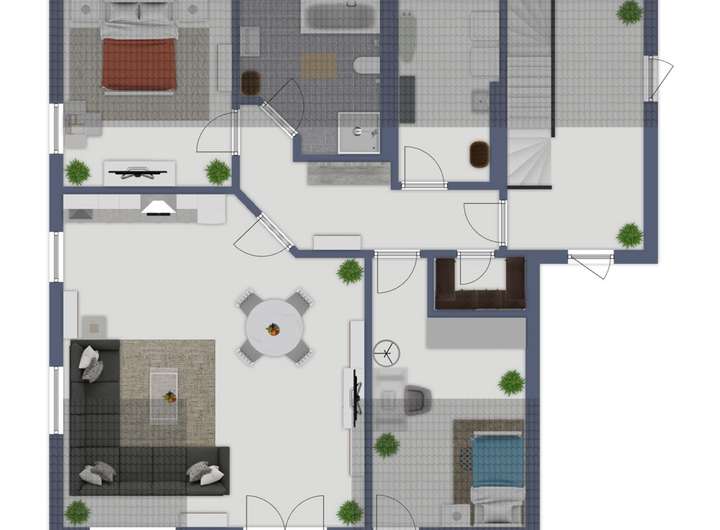Sämtliche Einrichtungsgegenstände (auch auf Terrassen und Balkonen bzw. in Gärten), Möbel (inkl. Küche), Beleuchtungselemente und Textilien dienen nur der künstlerischen Darstellung für den Prospekt und begründen keinen Anspruch auf Herstellung/Lieferung. Alleinig die Baubeschreibung ist für die Ausstattung maßgeblich. Bitte beachten Sie, dass für die Rechte und Pflichten aller Beteiligten im Falle des Erwerbs des Objektes allein die notarielle Beurkundung maßgeblich ist.