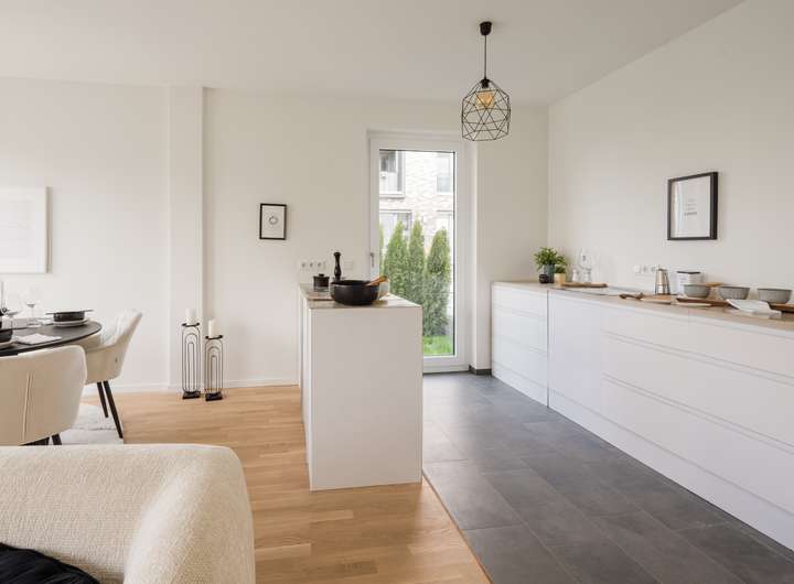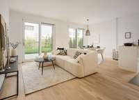 Das stilvolle Interieur wird durch hochwertiges Echtholzparkett und eine moderne Ausstattung geprägt, das dem großzügigen Wohn- und Essbereich eine elegante und behagliche Atmosphäre verleiht. Bodentiefe Fenster sorgen für eine hervorragende Lichtdurchflutung und eröffnen einen direkten Zugang zu Ihrem eigenen Garten sowie Terrasse mit Westausrichtung, der ideal für entspannte Stunden im Freien und gesellige Momente eignet.