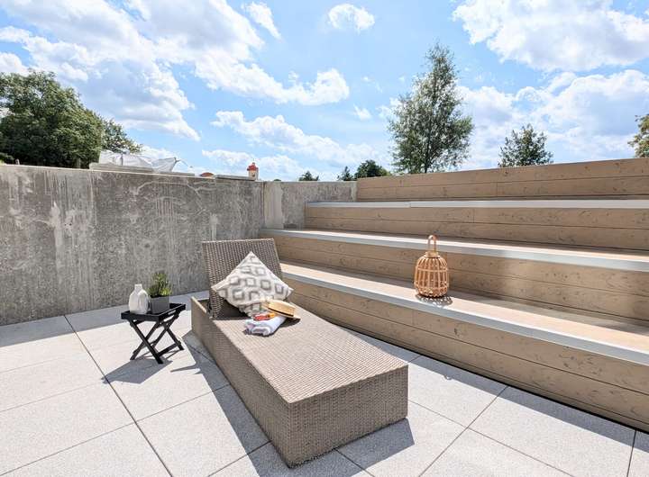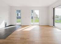 Im Erdgeschoss empfängt Sie ein großzügiger, offener Wohn- und Essbereich, der durch bodentiefe Fensterfronten und stilvolle Architektur begeistert. Hier verschmelzen Innen- und Außenbereiche harmonisch miteinander, denn von mehreren eleganten Terrassen mit Süd- oder Ostausrichtung, gelangen Sie in Ihren eigenen ca. 185 qm großen Garten. Dieser bietet nicht nur reichlich Platz für Erholung und Entspannung, sondern auch eine grüne Oase, die Ihr neues Zuhause um eine exklusive Freifläche erweitert.