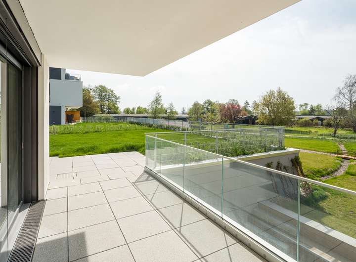 Die Gegensprechanlage mit Videofunktion von Busch Jäger an jedem Hauseingang, die wärmeschutzverglasten Fenster mit zusätzlichem außenliegenden Sonnenschutz, selbstverständlich elektrisch bedienbar, ein erhöhter Schallschutz innen, alle Balkonbrüstungen aus Glas, das ist schon ein besonderes Niveau.
