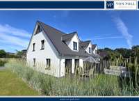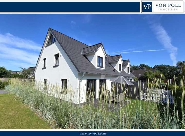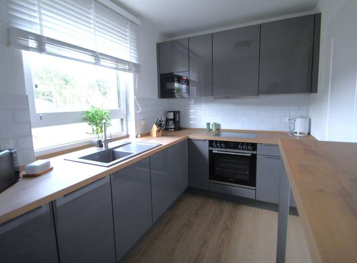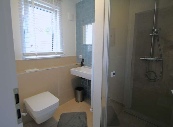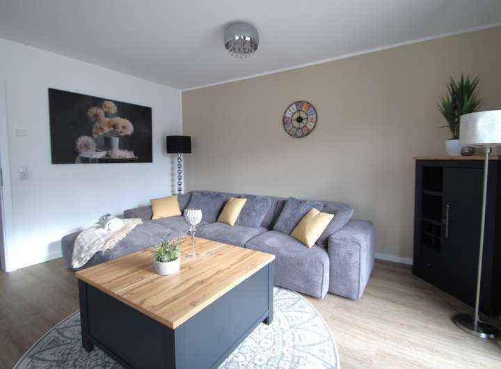 Im Erdgeschoss finden Sie neben einem Gäste-WC mit Dusche auch einen großen HWR mit Waschmaschine und Trockner. Ein Abstellraum befindet sich ebenfalls im Erdgeschoss. Die geschmackvolle Küche ist ebenfalls vollständig ausgestattet und verfügt über moderne Elektrogeräte. Das Wohnzimmer ist offen und hell gestaltet. Hierrüber erreichen Sie auch die Terrasse mit einem kleinen Gartenanteil zur alleinigen Nutzung.