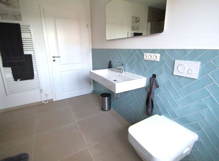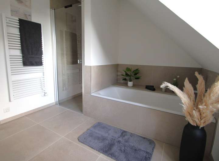 Im Obergeschoss befinden sich neben den drei Schlafzimmern auch ein großes Badezimmer mit Dusche und Badewanne. Das Badezimmer ist ebenfalls mit allem notwendigen wie zum Beispiel Handtüchern und Haartrockner ausgestattet. Einziehen und wohlfühlen ist hier die Devise.