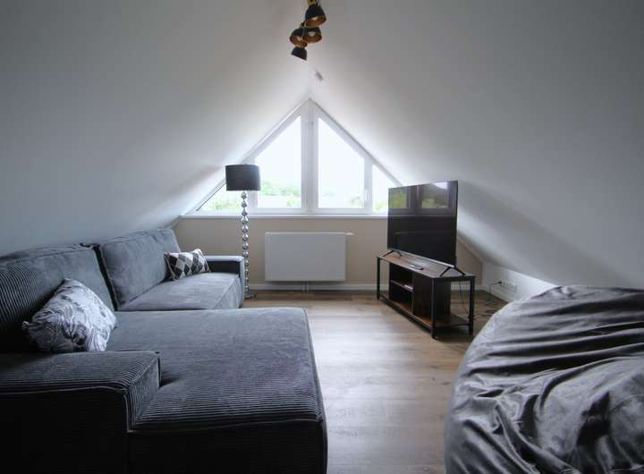 Der Spitzboden ist ausgebaut und bietet somit eine Art zweites Wohnzimmer mit Couch und TV-Anschluss.
