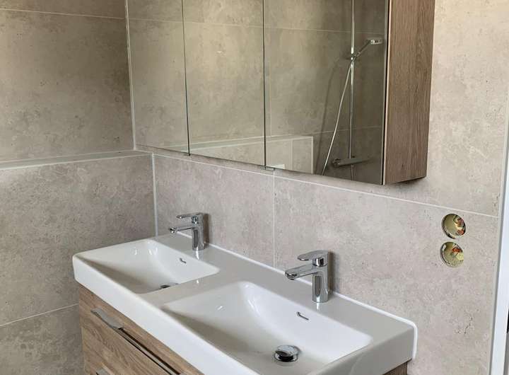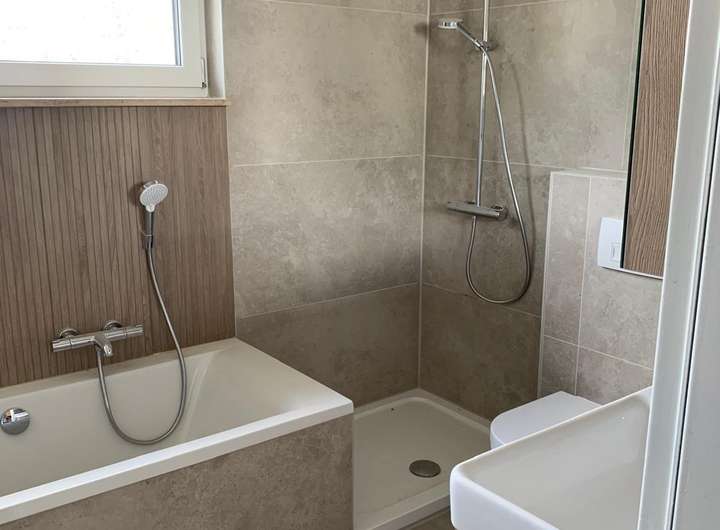 - Komplett renoviertes Badezimmer mit Badewanne, separater Dusche, modernen Armaturen und Waschtisch mit Unterschrank