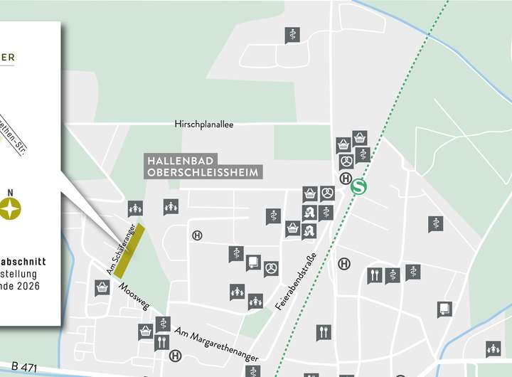 Eingebettet in eine landschaftlich reizvolle Umgebung mit vielen Grünflächen, Parks und Seen, überzeugt das sympathische Oberschleißheim gleichzeitig mit einer durchdachten Infrastruktur. Ob Einkaufsmöglichkeiten, Restaurants, Schulen oder Freizeiteinrichtungen – das Angebot ist attraktiv, die Wege sind kurz. Die S-Bahn, die nahe Autobahn sowie Buslinien ermöglichen zudem eine sehr gute Anbindung des Ensembles AM SCHÄFERANGER.