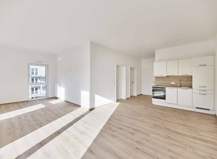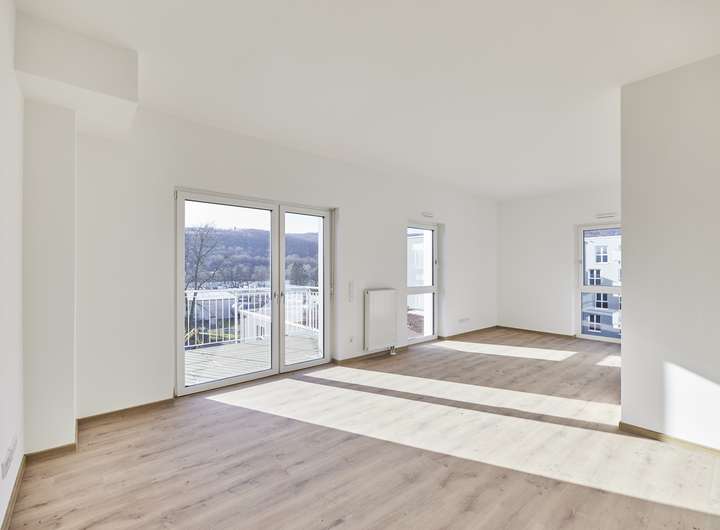 - Bodentiefe Fenster in Wohnbereich mit Austritt auf Balkon