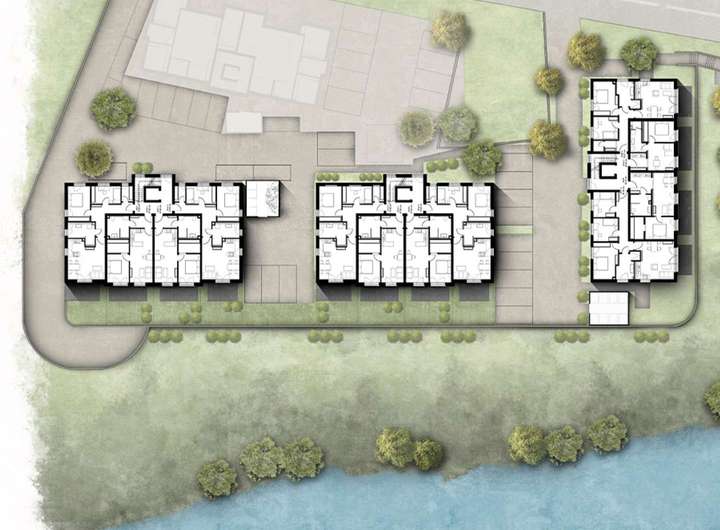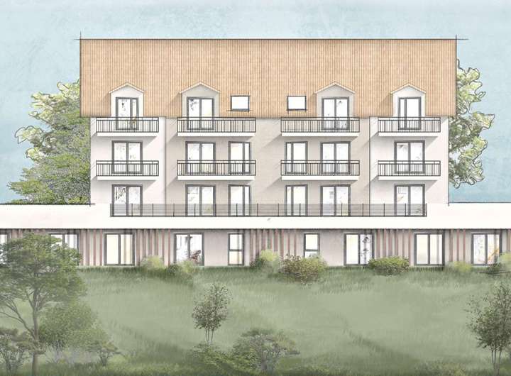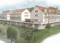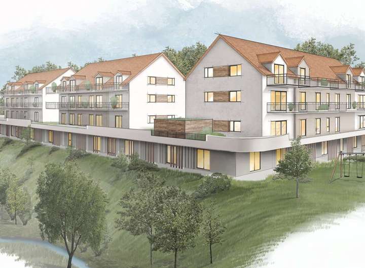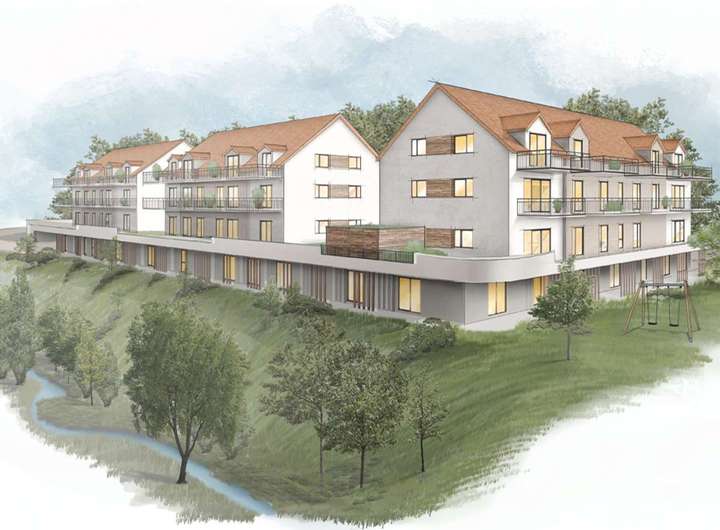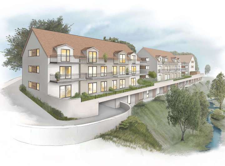 Im schönen Fellheim entsteht auf einer Grundstücksfläche von ca. 5.575 qm eine moderne, bereits genehmigte Mehrfamilienhausanlage. Drei ansprechend gestaltete Baukörper mit Satteldach bieten insgesamt 41 Wohneinheiten. Die Tiefgarage, die die Häuser unterirdisch miteinander verbindet, wurde geschickt geplant, um eine einfache statische Ausführung zu gewährleisten.