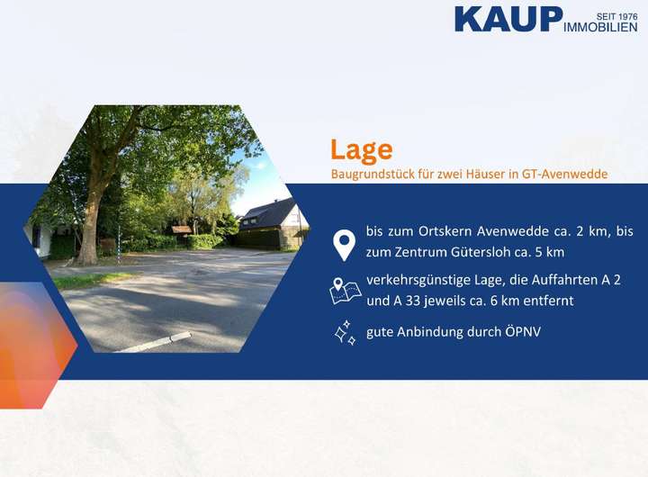 Das zum Verkauf stehende Baugrundstück befindet sich in verkehrsgünstiger Lage am Rande des Ortsteils Avenwedde-Bhf. Die Entfernung zum Zentrum Gütersloh beträgt ca. 5 km. Die nächsten Autobahnauffahrten zur A 33 bzw. A 2 sind nach jeweils ca. 6 km zu erreichen. Darüber hinaus ist über die ca. 2 km entfernte Haltestelle Avenwedde-Bhf. eine gute Anbindung an die Stadt Bielefeld und das Schienennetz der Deutschen Bundesbahn gegeben. Öffentliche Einrichtungen, Schulen, Kindertageseinrichtungen und Nah-versorger sind tlw. in Avenwedde-Bhf. und darüber hinaus in den umliegenden Ortsteilen sowie im Zentrum Gütersloh vorhanden. Eine Bushaltestelle befindet sich direkt am Objekt.