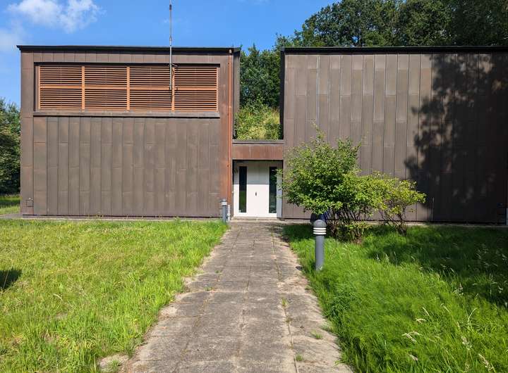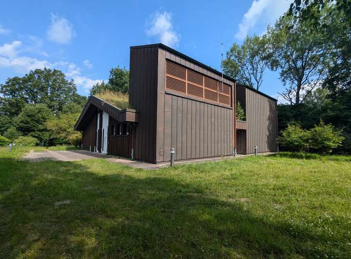Einzigartiges im grünen gelegenes Grundstück mit Privatsphäre am Rand vom Hamburg Barmbek. Die aufstehende Bebauung besteht aus einem massivem Gesamtbauwerk mit zwei oberirdisch sichtbaren eingeschossigen Bauteilen - insgesamt 2.760m² BGF. Das Bauwerk beherbergt Büroflächen, kleine Garagen, unterirdische Lagerflächen und die technische Infrastruktur für die Belüftung und die Stromversorgung. Der unscheinbare Haupteingang wird eingerahmt von monomentalen Lüftungstürmen. Das begrünte Grundstück mit lockerem Baumbestand ist eingerahmt von einer Hecke und besitzt einen Naturteich zur Regenentwässerung. Die Begrünung setzt sich auf den Dächern des Bauwerkes fort und sorgt für einen entspannten Gesamteindruck - Natur pur.