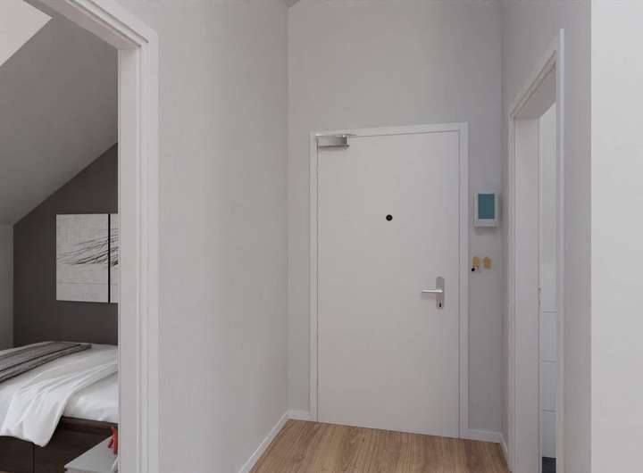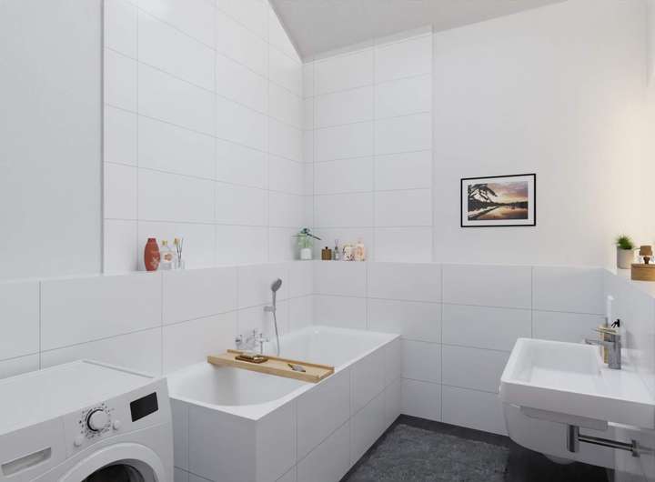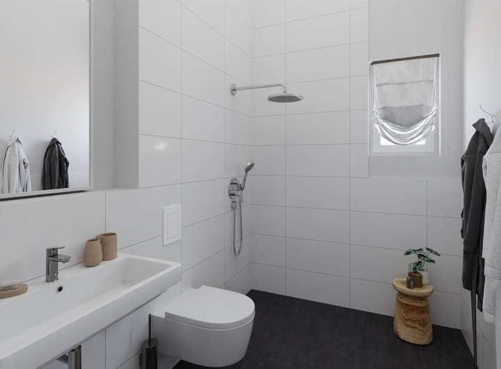 Treten Sie ein in Ihren neuen Wohntraum. Der Eingangsbereich führt Sie direkt in den großzügigen Wohnbereich, der nahtlos in die offene Küche übergeht. Hier können Sie mit Familie oder Freunden gemütliche Abende verbringen. Das Highlight ist die Dachterrasse, die sich perfekt für entspannte Stunden im Freien eignet. Zwei moderne Badezimmer bieten mit Badewanne und Dusche ausreichend Platz und Ausstattung für Ihre tägliche Routine.