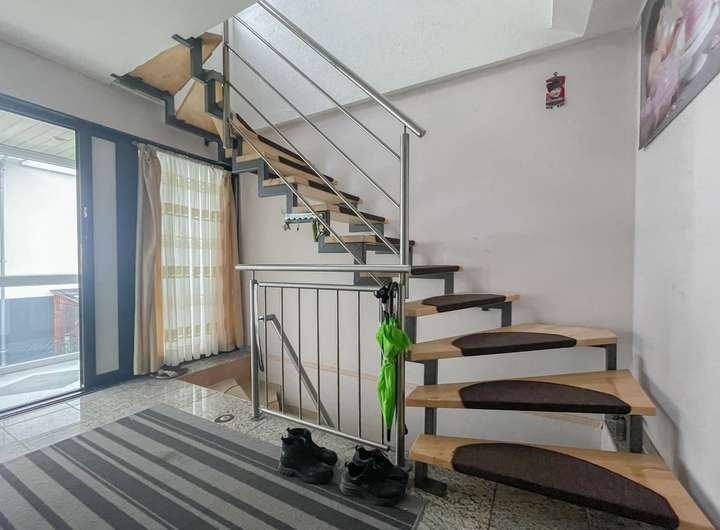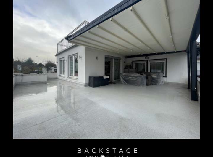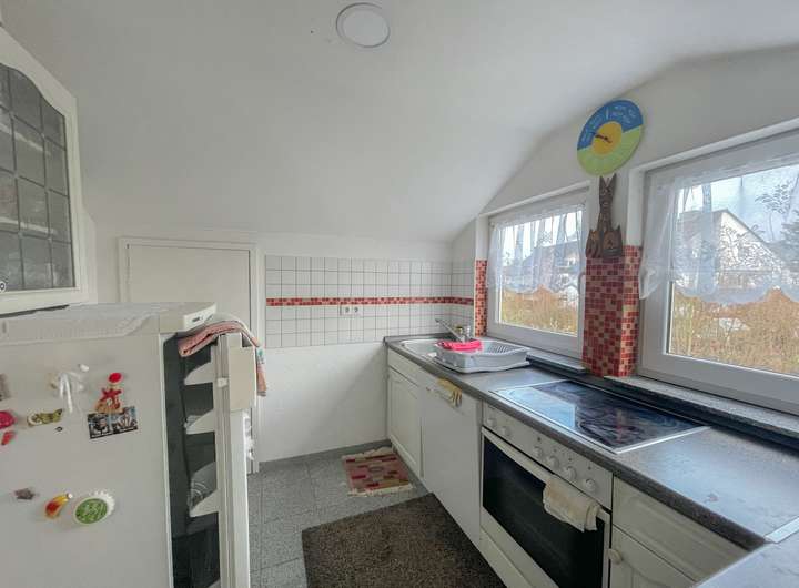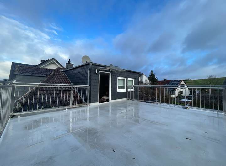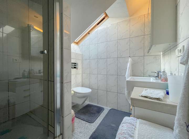 Das Obergeschoss bietet aktuell ein gemütliches Schlafzimmer, ein Tageslichtbad mit Dusche und ein geräumiges Wohnzimmer mit direktem Zugang zur großen Dachterrasse. Außerdem befindet sich eine EBK im Obergeschoss.