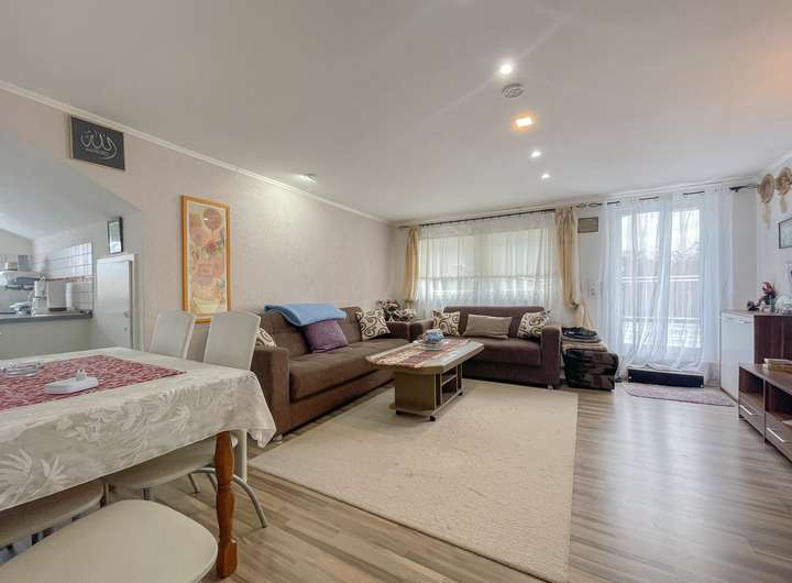 Jede Wohneinheit verfügt über ein modernes, helles Tageslichtbad mit Dusche oder Badewanne, sowie eine Einbauküche. Besonders beeindruckend ist das knapp 60 Quadratmeter große Wohnzimmer im Haupthaus, das viel Platz für gemeinsame Aktivitäten bietet und durch seine Großzügigkeit und Helligkeit besticht.