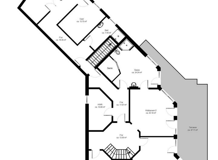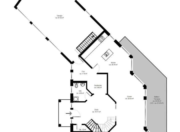 Die Gesamtwohnfläche von ca. 270 m² sowie die wohnlich ausgebaute Nutzfläche von ca. 145 m² bietet Platz für fünf Zimmer, drei Bäder, eine Garage mit genügend Fläche für drei Fahrzeuge, einen separaten Bereich für Gäste / Au-pair, einen Wellness- / Sportbereich mit Dampfsauna in dem Souterrain und zwei Terrassenebenen.