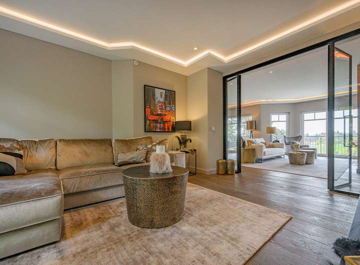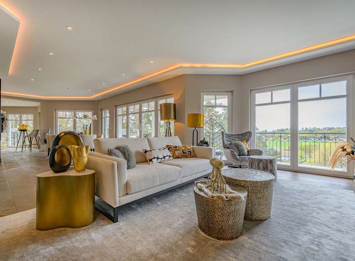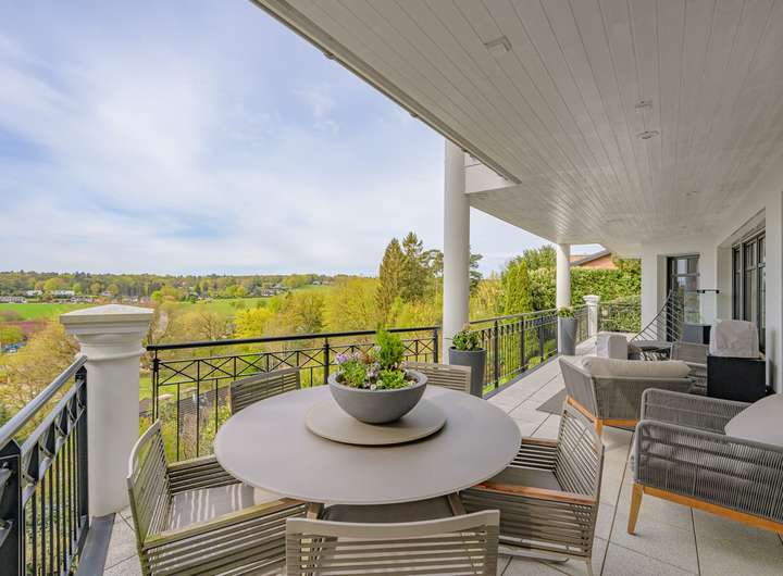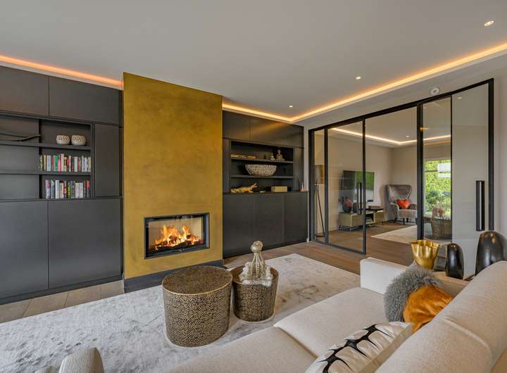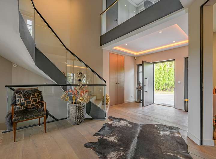 Die eindrucksvolle Eingangstür führt in das großzügige Entrée und bietet einen direkten Blick auf die Galerie des lichtdurchfluteten Obergeschosses sowie in den imposante Wohn-/Essbereich der Villa. Das Wohn- und Esszimmer besticht mit einem edlen Kamin und ist der zentrale Raum für die Familie und geht über in die große offene Wohnküche mit ihrem klaren Design, ausgestattet mit den hochwertigsten technischen Geräten. Über die bodentiefen Fenster gelangen Sie auf die großzügige Veranda und genießen dort den herrlichen Weitblick. Ein modernes Gäste-WC und eine versteckte Garderobe runden das Erdgeschoss ab. Selbstverständlich gelangen Sie über das Erdgeschoss in die großzügige Garage, wo mehrere Fahrzeuge Platz finden. Eine Treppe führt Sie auf die Galerie des Obergeschosses. Ein komfortables Masterschlafzimmer mit Blick in die Natur bietet ein exklusives Bad en Suite mit vielen hochwertigen Details. Zwei weitere Schlafzimmer und ein weiteres Duschbad stehen zudem zur Verfügung. Im Souterrainbereich befindet sich eine kleine Fitnessoase der Erholung. Für Gäste/Au-pair steht ein guter wohnlich ausgebauter Bereich mit zwei Zimmern sowie einem separaten Eingang zur Verfügung.