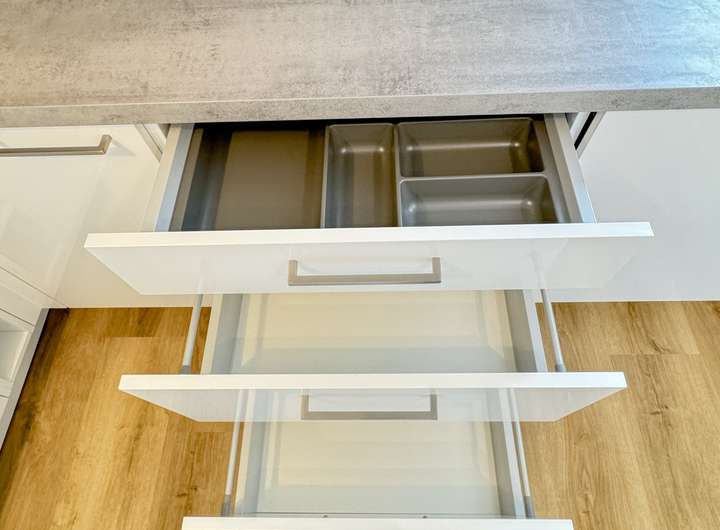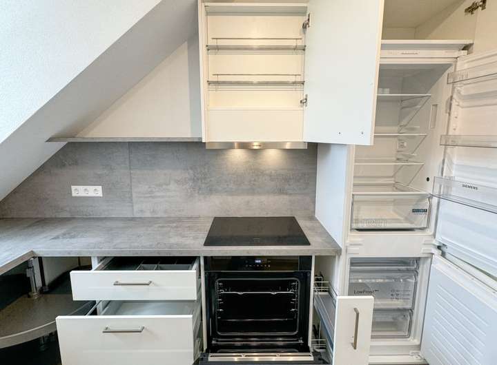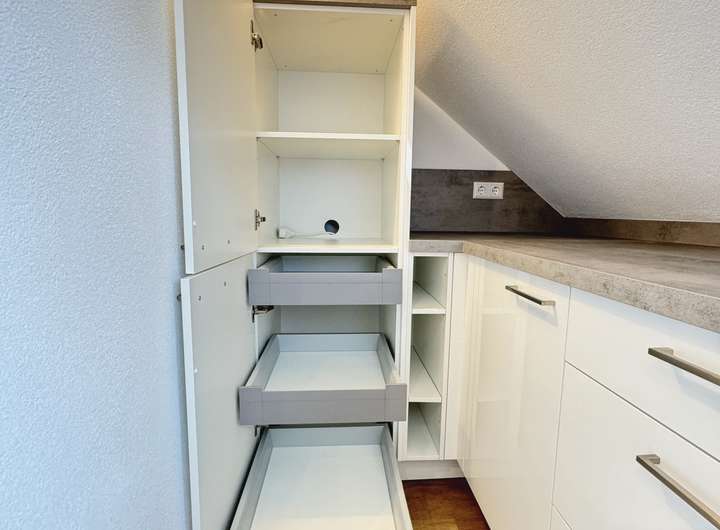 Die neue Küche im Wert von über 15.000.- lädt durch ihre Großzügigkeit zum Kochen ein und ist ein richtiges Stauwunder. Es wurde an keinem Detail gespart, so verfügt die Küche u.a. über ein Induktionskochfeld (Siemens), einer großen Kühl-Gefriere Kombination (Siemens), einem Einbaubackofen mit Selbstreinigungsfunktion (Siemens), einem riesigen Vorratsschrank, einem Geräte-/Besenschrank mit Steckdosen, einem 60cm vollintegrierten Geschirrspüler, einem Drehkarussell für die Töpfe einem großen Besteckeinsatz sowie die passende Beleuchtung.