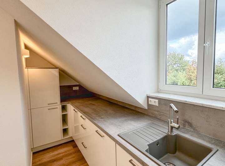 Diese geräumige Traumwohnung befindet sich im Dachgeschoss eines gepflegten Mehrfamilienhauses und besticht mit einem großzügigen Wohn- und Essbereich, einer komplett neuen Küche, einem großzügigen Balkon, zwei Schlafzimmer, einem Badezimmer mit Dusche und Badewanne, einem separaten Gäste WC, einer Garage und einem Außenstellplatz sowie einem eigenen großen Kellerraum. Des weiteren verfügt das Objekt über einen separaten Wasch-/Trockenraum.