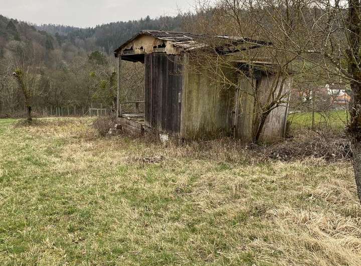 Das Freizeitgrundstück mit ca. 1077 qm hat eine renovierungsbedürftige Geschirrhütte mit Aussichtsterrasse.