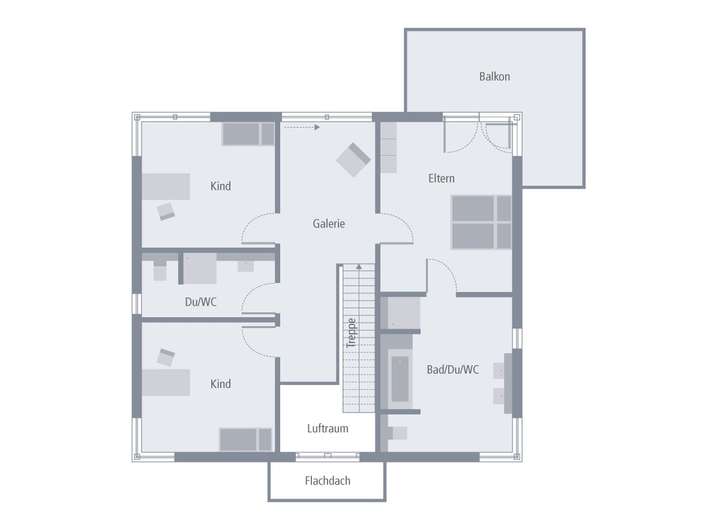 Im Obergeschoss liegt die Galerie zwischen dem Elternbereich mit Schlafraum, Balkonzugang sowie großem Bad und dem Terrain der Kinder.