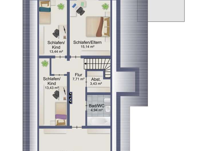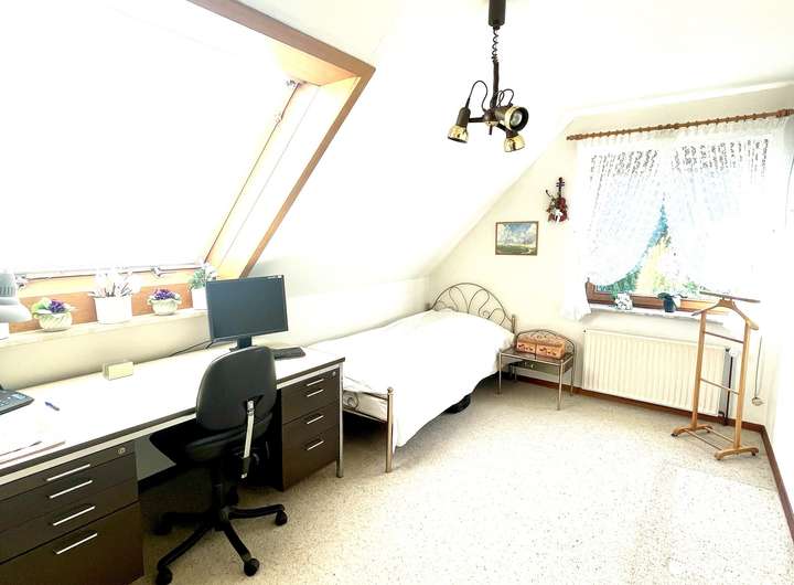 Das Dachgeschoss ist mit einem Schlafzimmer, zwei Kinderzimmern sowie einem Vollbad und einem großen Wohnzimmer sowie einer Abstellkammer.