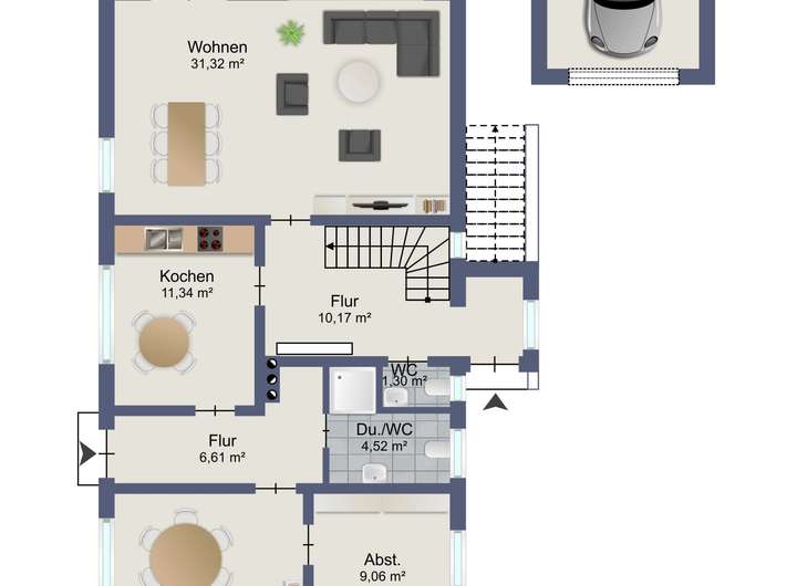 Die ebenfalls im Erdgeschoss gelegene Zweizimmer-Einliegerwohnung verfügt über einen separaten Eingang.